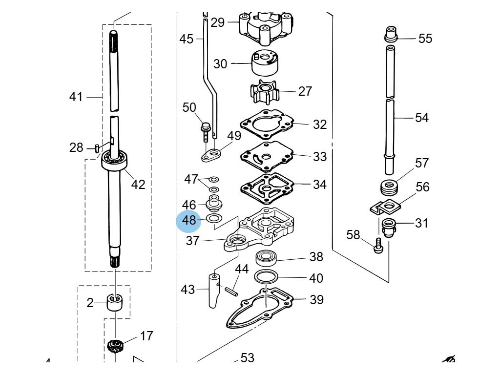 This larger O-ring (2.4 mm thick x 15.4 mm ID) seals the gear shift rod carrier/bushing (sometimes called cam rod bushing) in the lower unit/gear case on Tohatsu small 2-stroke portable outboards (4–9.8 HP models) from 2013 through 2025. It prevents water intrusion and oil leakage around the shift rod mechanism.