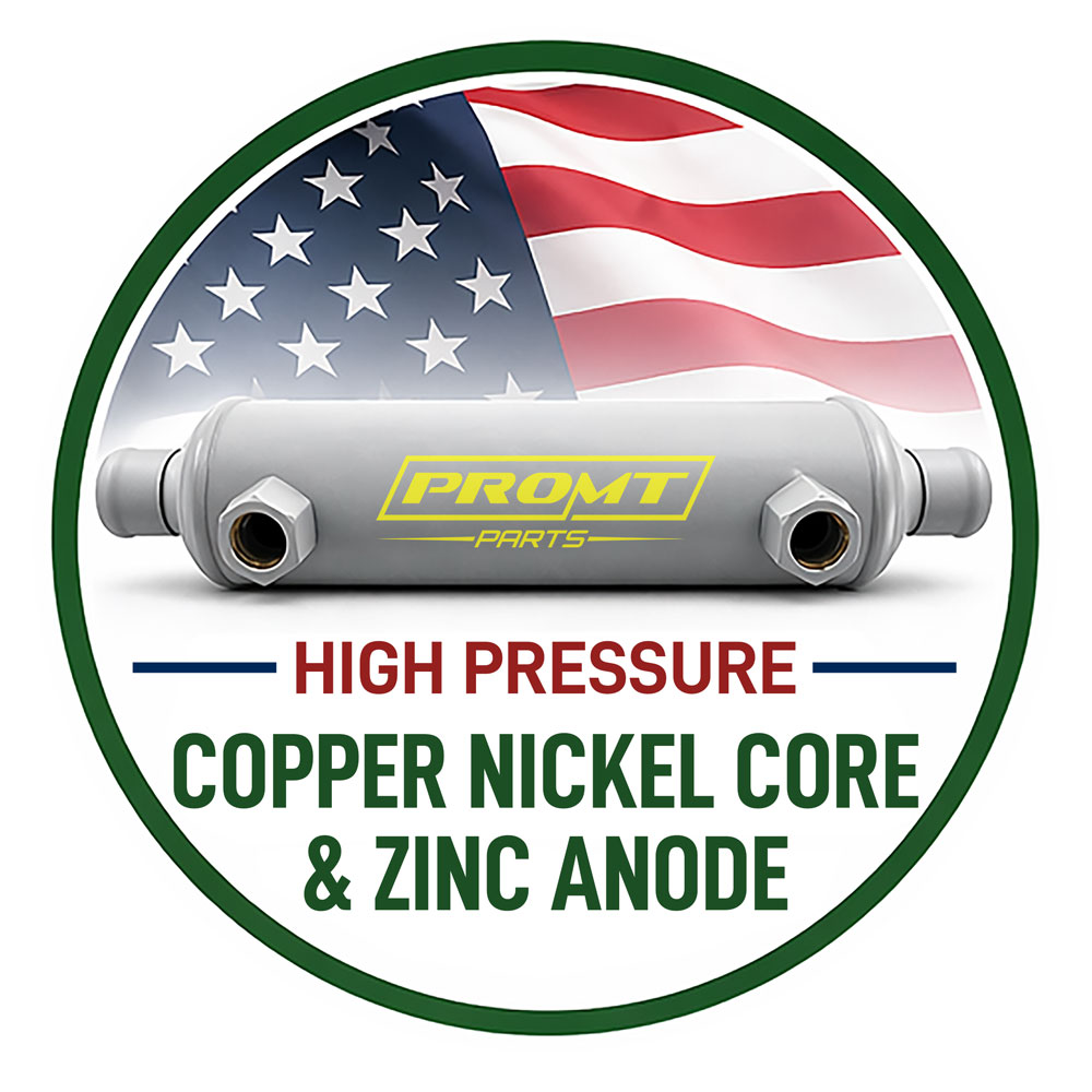 This premium oil cooler features a 90/10 copper-nickel core, heavy-gauge brass end caps, a factory-installed zinc anode with grounding lug, oil ports brazed with 45% silver. Perfect for cooling engine oil, transmission oil, and hydraulic fluid. Tested and rated for working pressure up to 375 PSI.